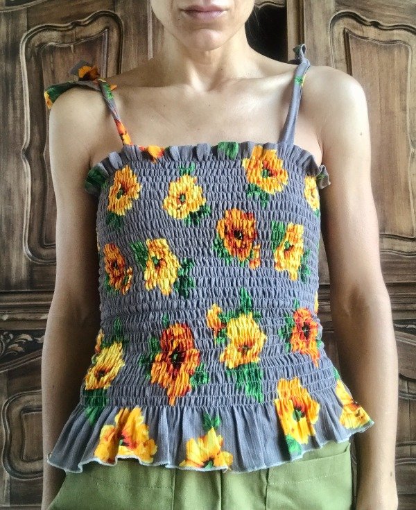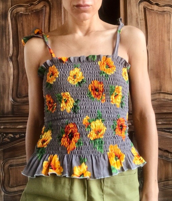 Musculosa confeccionada en bambula estampada, con lazos para atar