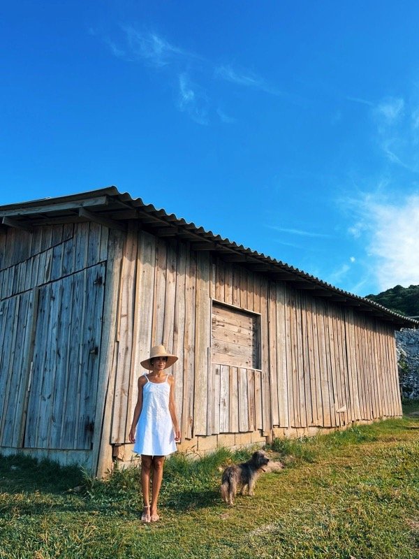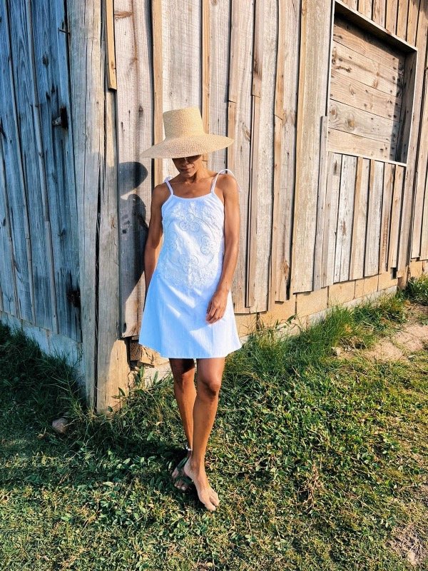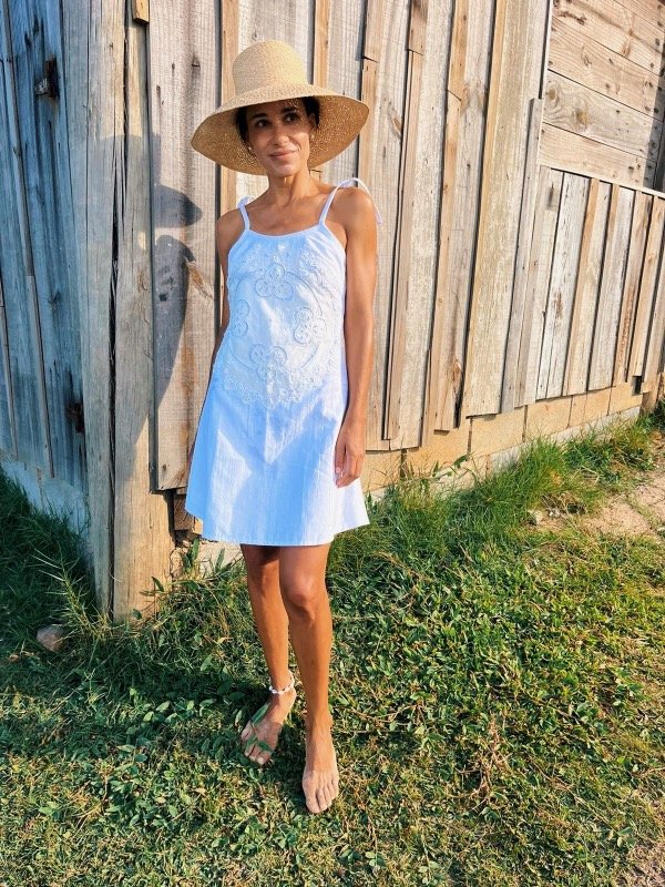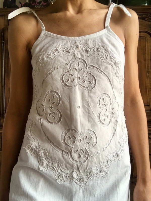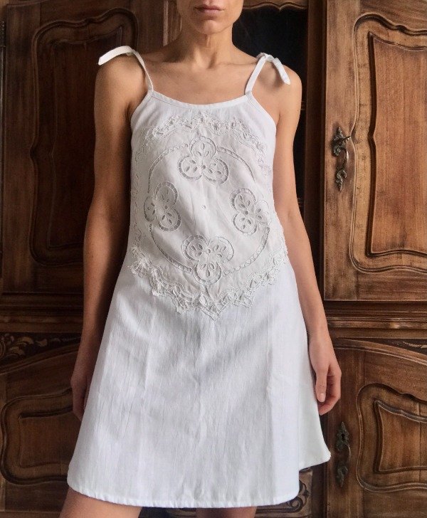 Vestido confeccionado con tela 100% algodón, detalle de carpeta antigua. Con breteles para atar y cierre en la espalda.