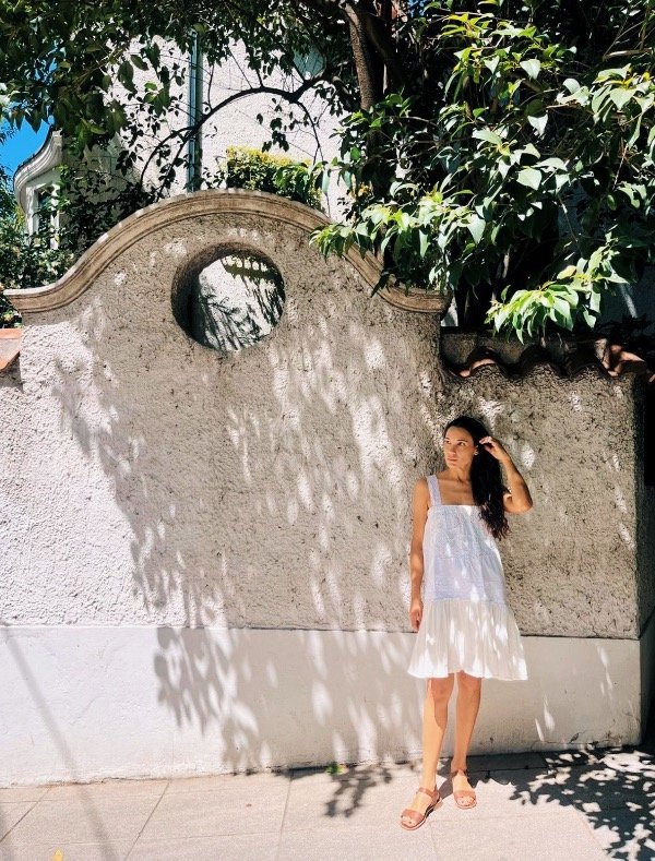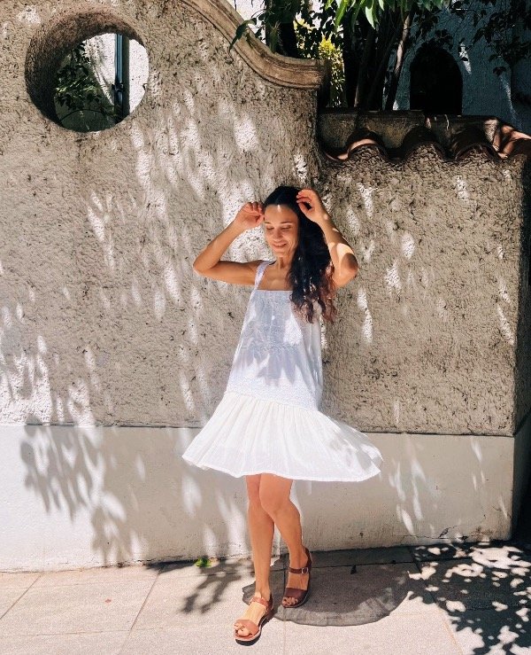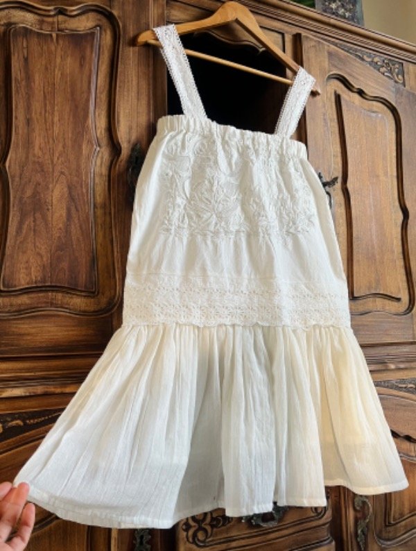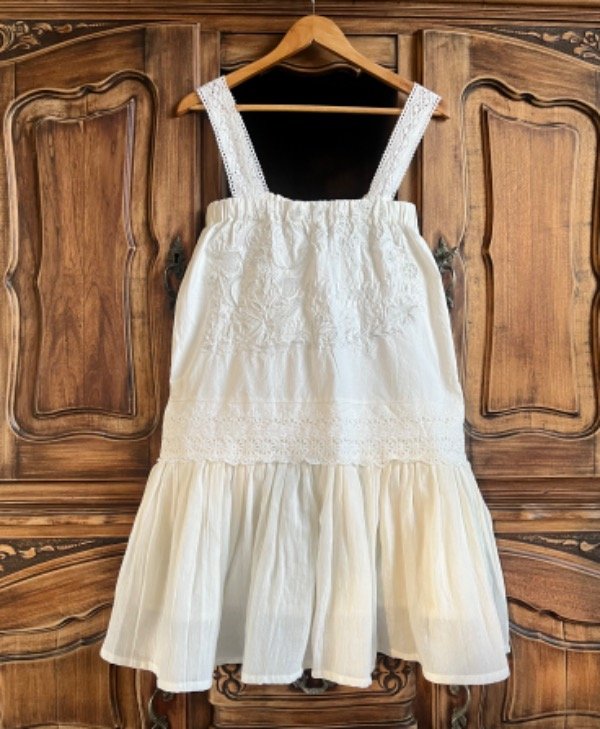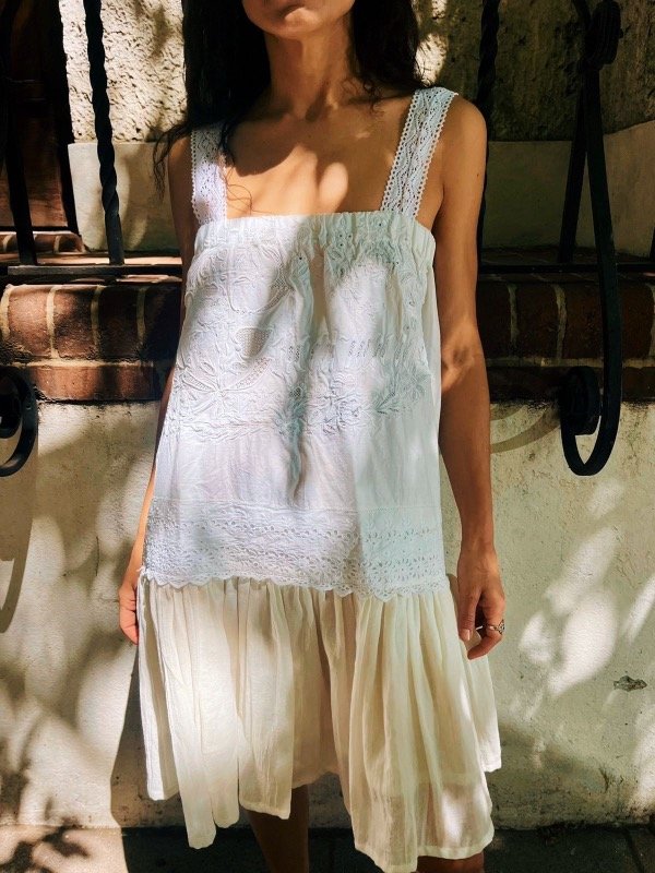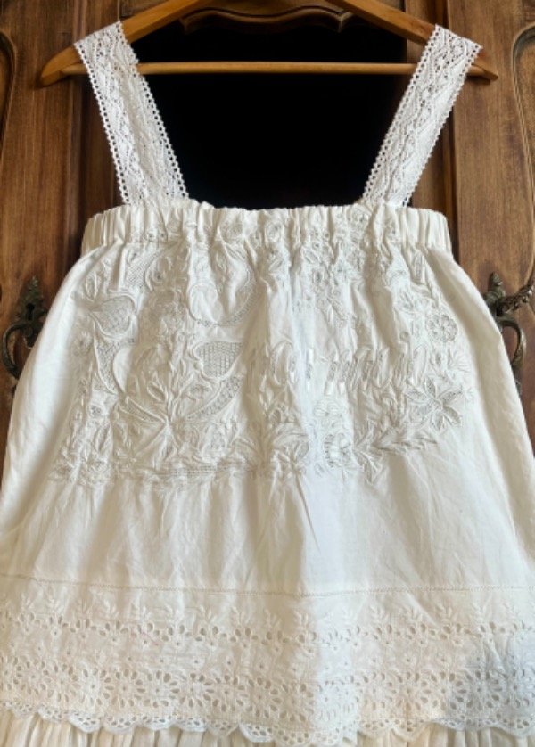 Vestido único confeccionado en gasa de algodón y mantel antiguo bordado, con breteles de encaje antiguo.