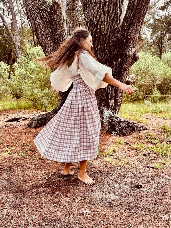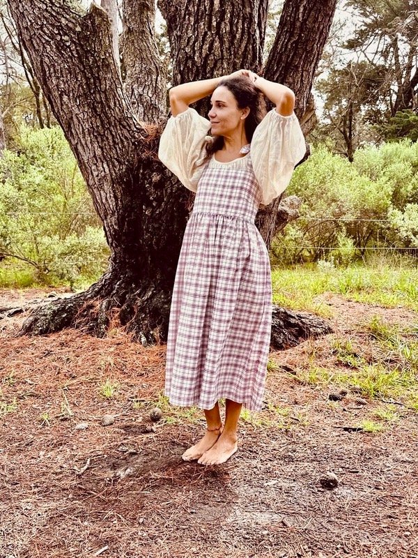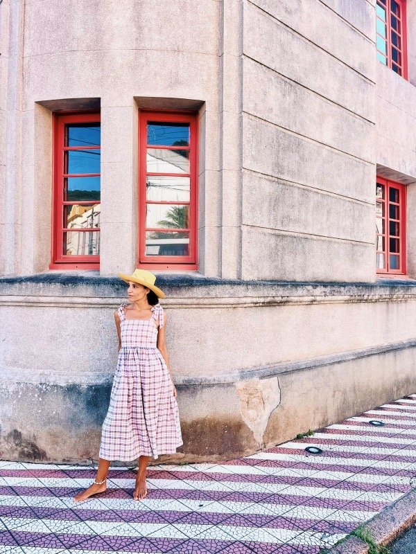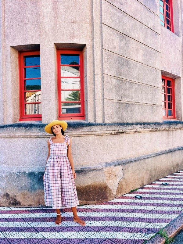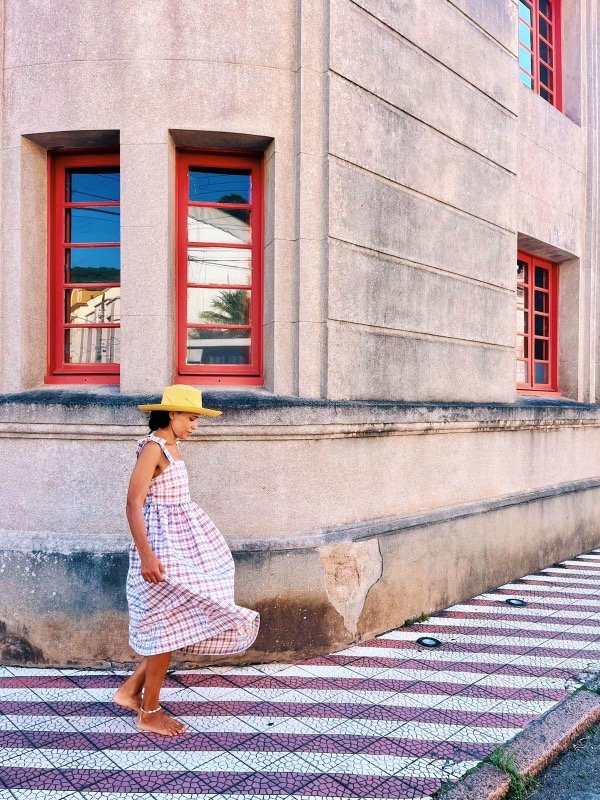 Vestido confeccionado en tela 100% algodón, con hilo elástico en la espalda y bolsillos laterales.