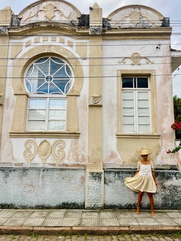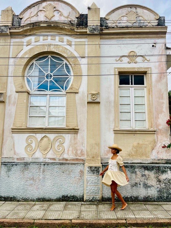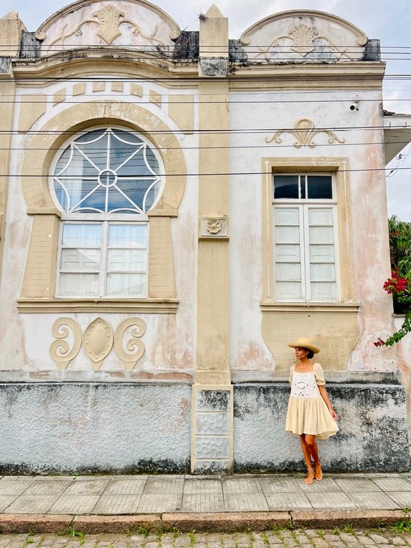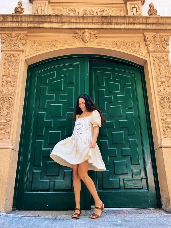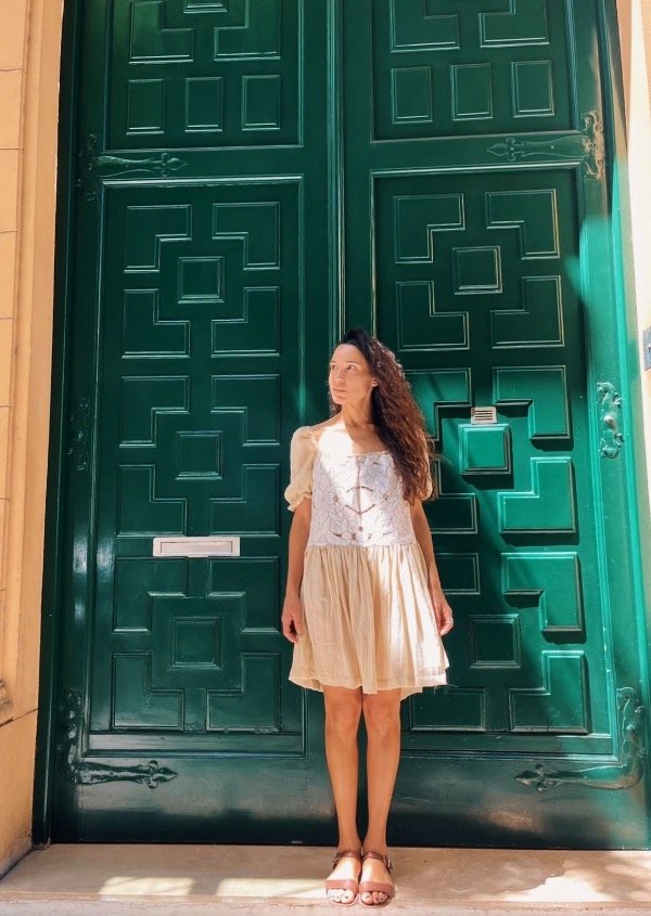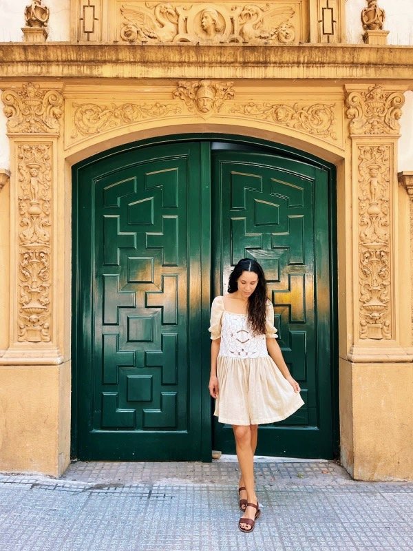 Vestido confeccionado en gasa de algodón y carpeta antigua bordada.