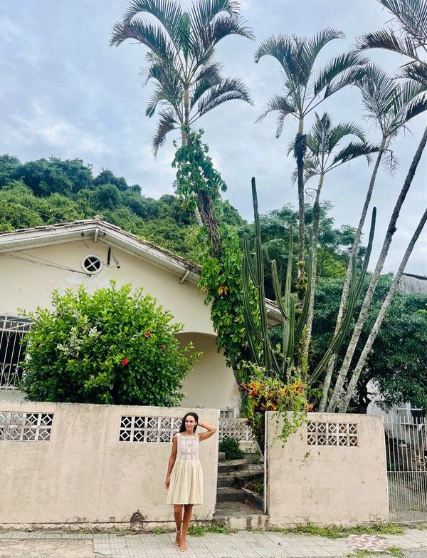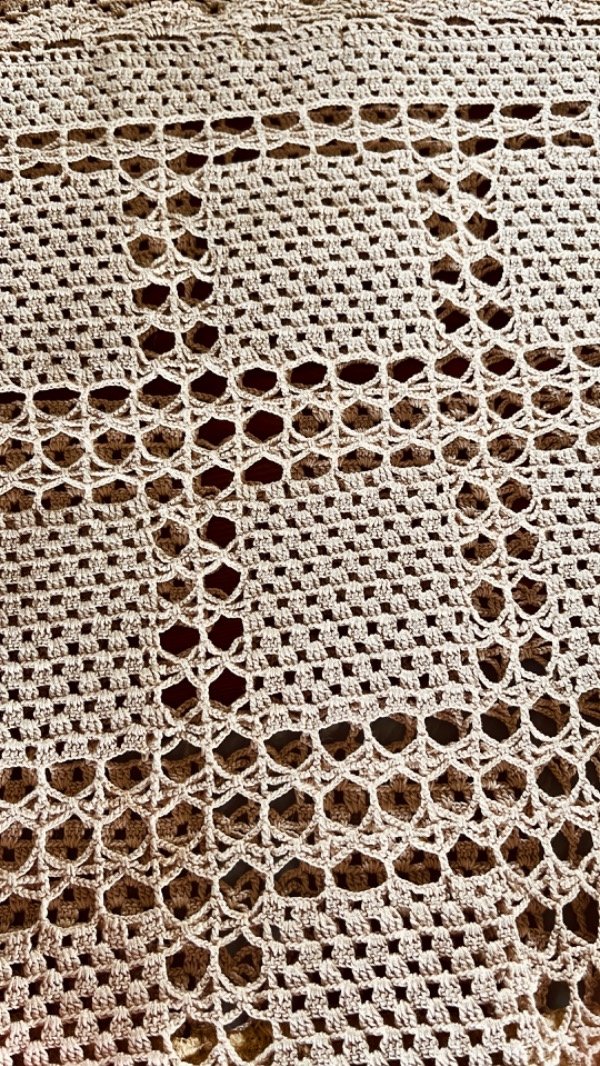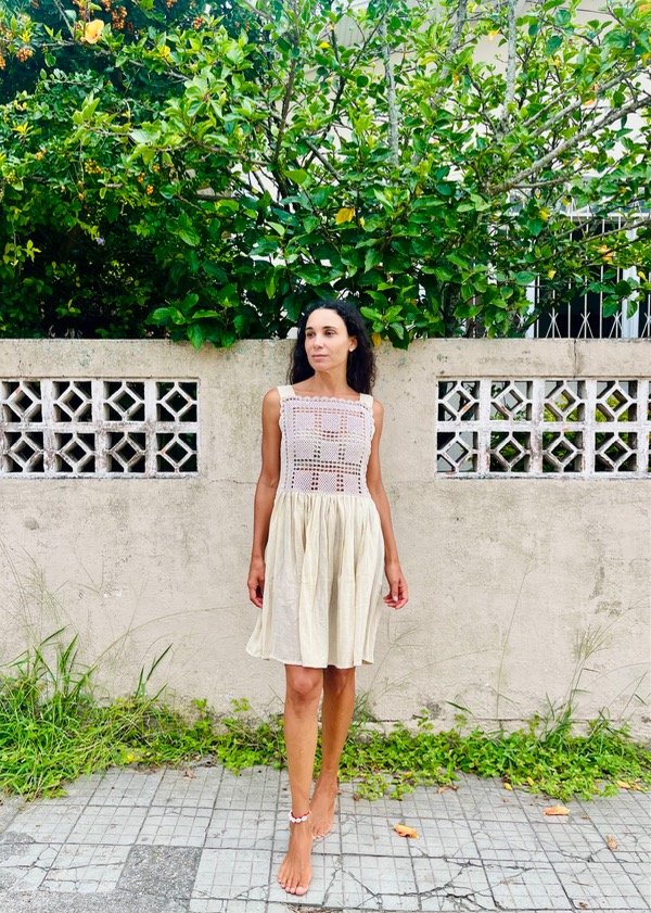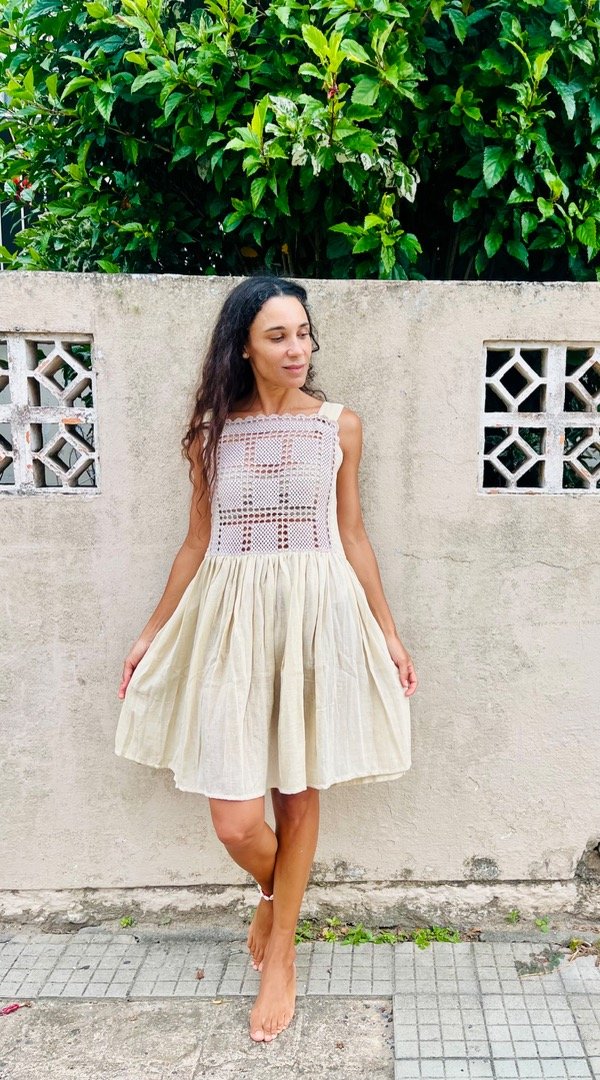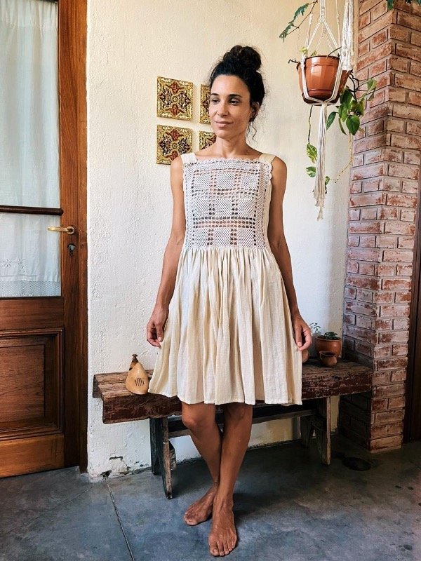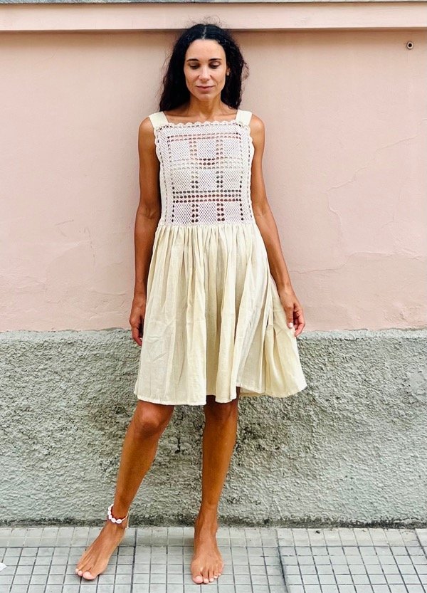 Vestido confeccionado en gasa de algodón con carpeta antigua.
