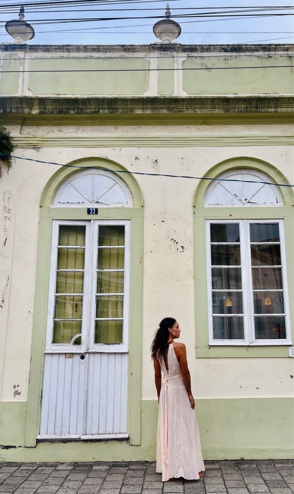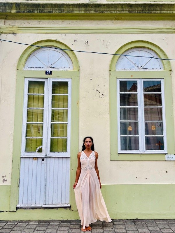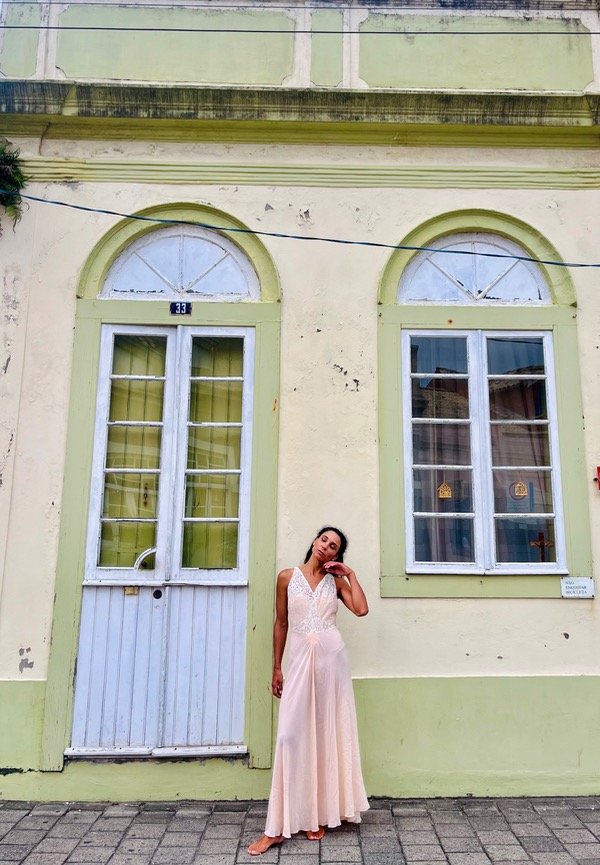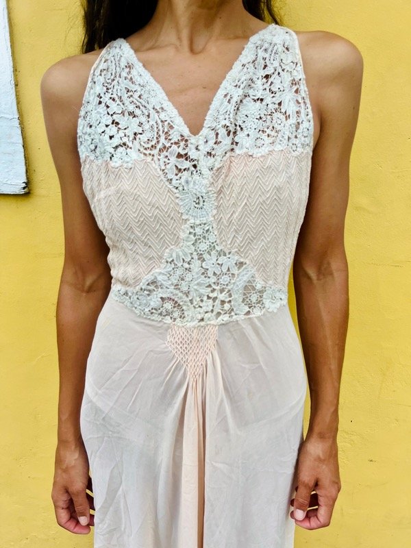 Vestido vintage confeccionado en gasa crepe con detalle de bordado y encaje súper antiguo de algodón.
